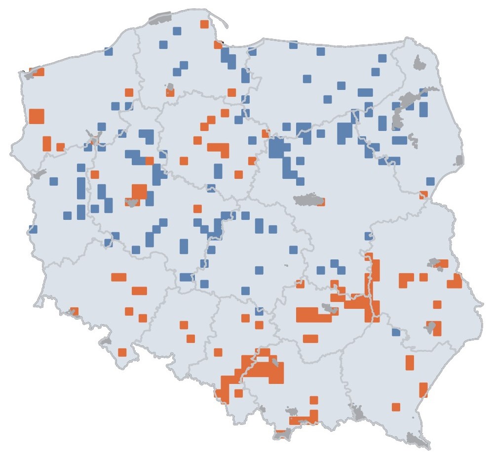 Gorące (hot-spots) i zimne (cold-spots) obszary dla liczby gatunków rodzimych, na tle położenia istniejących Parków Narodowych i podziału kraju na województwa. Gorące i zimne punkty wyznaczono jako 5% kwadratów z odpowiednio, największą i najmniejszą liczbą gatunków rodzimych Źródło danych: Szymura T., Kassa H., Swacha G., Szymura M., Zając A., Kącki Z. (2023) Vascular plant species richness in Poland version 1.1. under CC BY 4.0 licence |